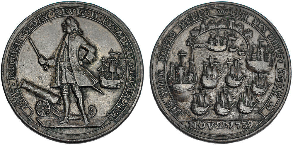 El éxito de estas medallas reside sin duda en la popularidad de sus protagonistas, dos personajes de la talla histórica del almirante inglés Edward Vernon (1684-1757) y el español Blas de Lezo (1689-1741). El contexto histórico en el que se acuñaron fue una de las varias guerras que enfrentaron a España y Gran Bretaña en el siglo XVIII, la conocida como “Guerra del Asiento” o “Guerra de la Oreja de Jenkins” que enfrentó a las dos naciones entre 1739 y 1748 por disputas comerciales. El objetivo británico durante la contienda fue paralizar el comercio español desde América atacando los cuatro puertos estratégicos del Caribe: Portobelo, Cartagena, La Habana y Veracruz.