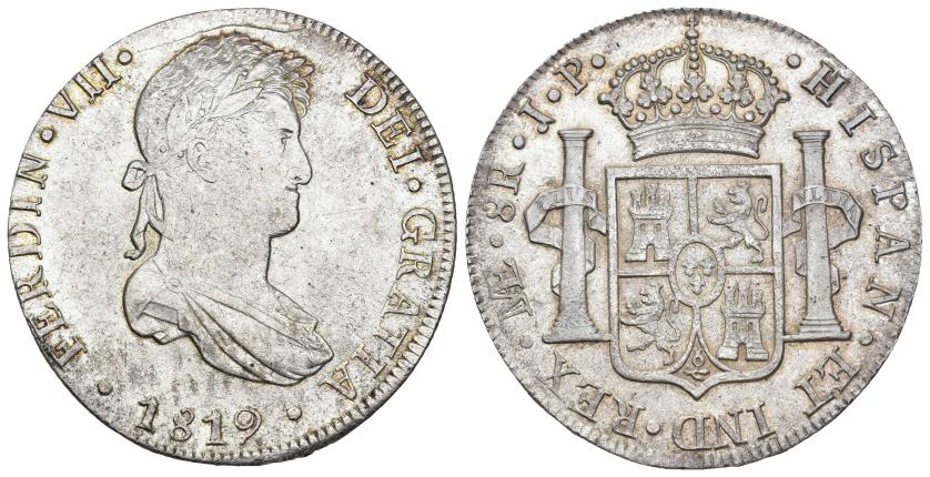 FERNANDO VII. 8 reales. 1819. Lima. JP. AR 26,7 g. 38,3 mm. VI-1050; AC-1252. Leves porosidades en rev. EBC-.