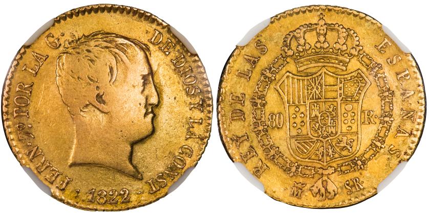 FERNANDO VII. 80 reales. 1822. Madrid. SR. AR. VI-1344; AC-1641. Encapsulada NGC-VF DETAILS. Pequeñas marcas. MBC-/MBC.