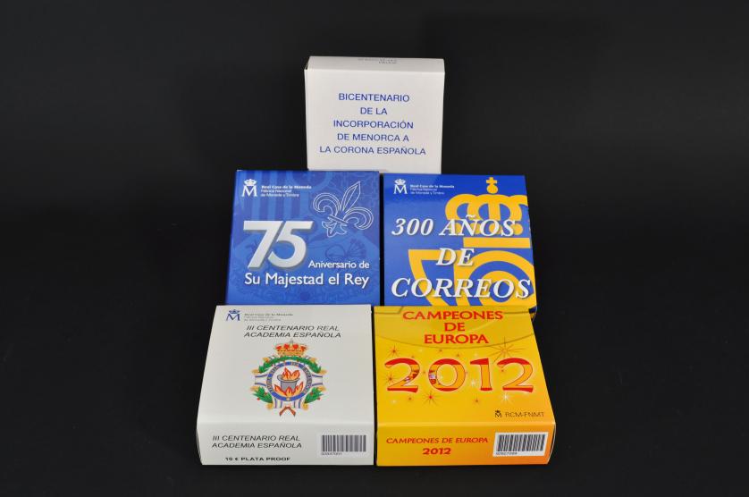JUAN CARLOS I. Lote de 5 estuches de 10 euros conmemorativos de la FNMT (AR 27 g): bicentenario de la incorporación de Menorca a la corona española, 2002; campeones de Europa, 2012; 75 aniversario de su majestad el Rey, 2013; III centenario Real Academia Española, 2014; 300 años de Correos, 2016. En su estuche y con certificado de autenticidad. Proof.