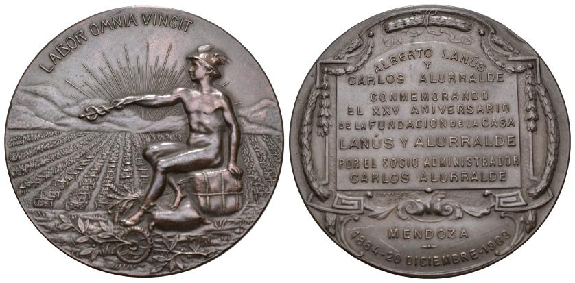 MONEDA EXTRANJERA. ARGENTINA. Medalla. XXV Aniversario de la Casa Lanús y Alurralde Mendoza. Grabador: Gottuzzo y cía. 1909. AE 67,5 g. 53 mm. EBC.