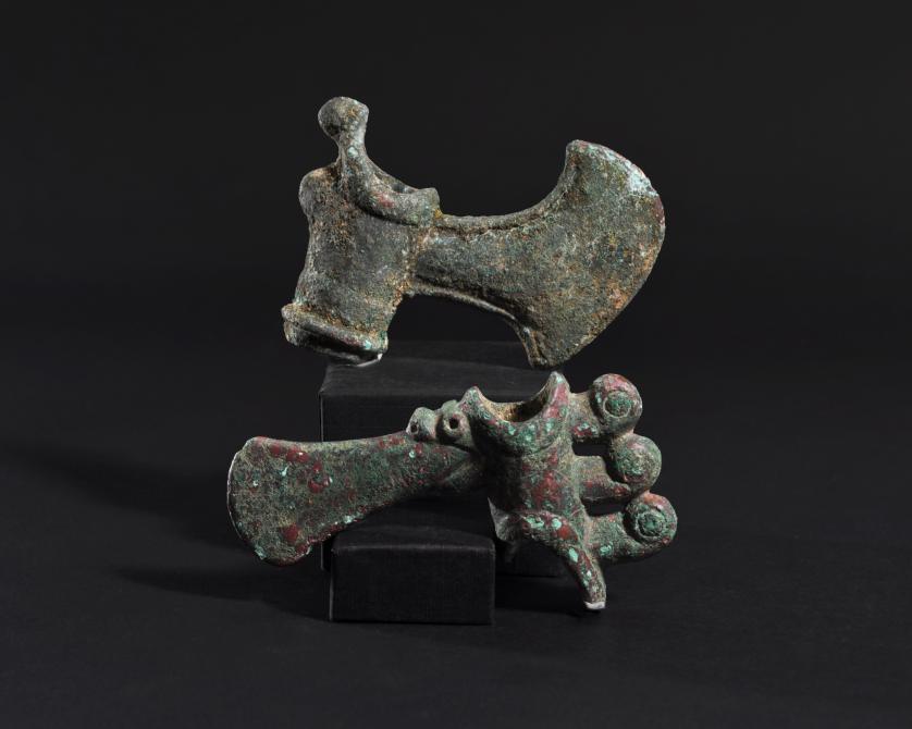 ARQUEOLOGÍA. PRÓXIMO ORIENTE. Luristán. Lote de 2 cabezas de hacha (ss. IX-VI a.C.). Bronce. Longitud de 9,5 a 10,2 cm. Presencia de cloruros.