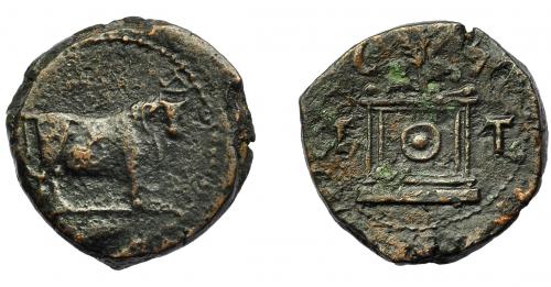 HISPANIA ANTIGUA. TARRACO. Tiberio. Semis (post. 15 d.C.). A/ Toro mitrado parado a der. sobre línea. R/ Altar con palma; C V/ T-T. AE 4,57 g. 18,7 mm. I-2377; APRH-231; ACIP-3271. Pátina oscura. MBC-.
