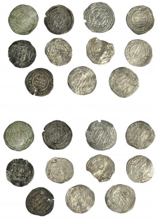406   -  ACUÑACIONES HISPANO-ÁRABES. CALIFATO. Lote de 11 dirhams Al-Andalus: Al-Hakan II (2), Hixan II (9). 1 falta un fragmento y 2 con perforaciones. BC+/MBC-.