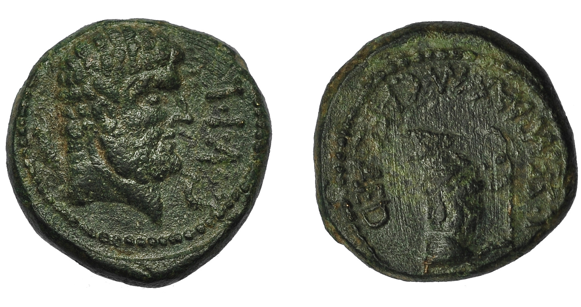 KELSE-CELSA. Semis. A/ Cabeza masculina barbada a der., detrás clava, delante externa C.V.IL. R/ Toro a der.; L SEMP MAX M CAEC AED. AE 6,75 g. 20 mm. I-801. RPC-265. APRH-265. Pátina verde. Rev. ligeramente descentrado. MBC. Rara.