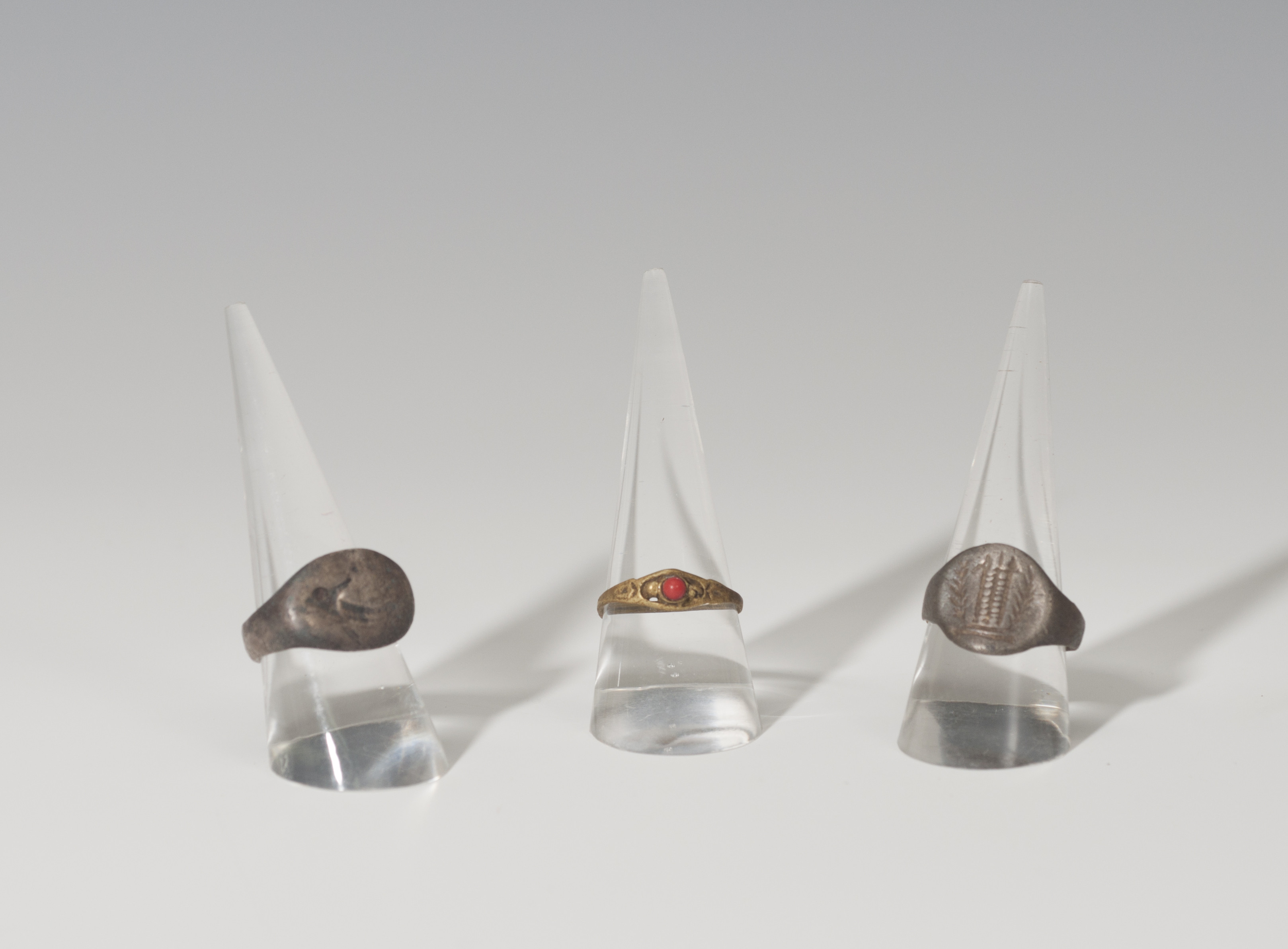 ROMA y EDAD MODERNA. Lote de tres anillos (I a.C.-I d.C., III-IV d.C. y XVII-XVIII). Plata y cobre dorado. Con representación de delfín a la izquierda, con trofeo central y con piedra decorativa roja central. Uno pegado. Diámetros interiores 17-19 mm.