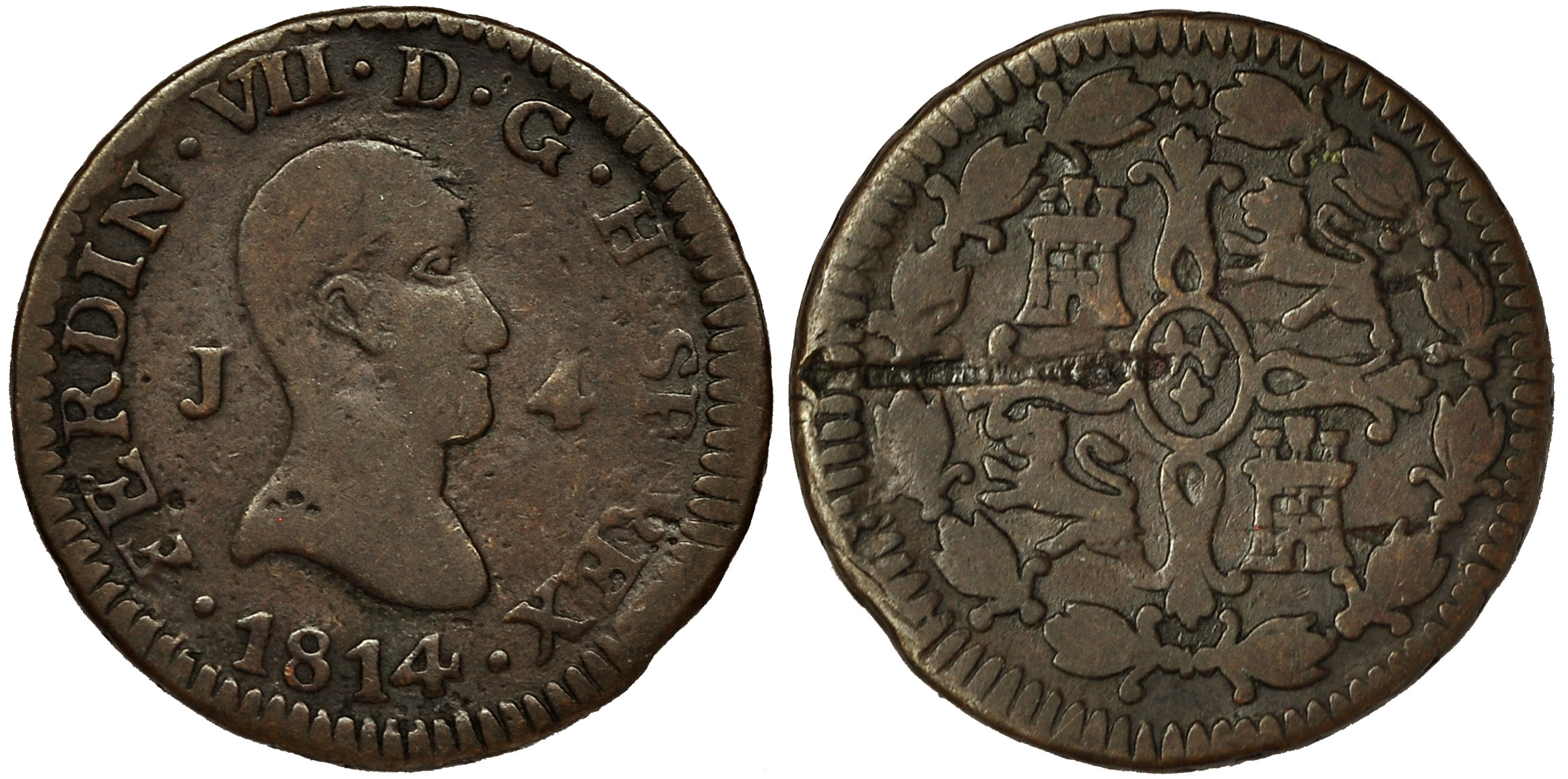 FERNANDO VII. 4 maravedís. 1814. Jubia. VI-166. Defecto de cospel en rev. BC+. Rara.
