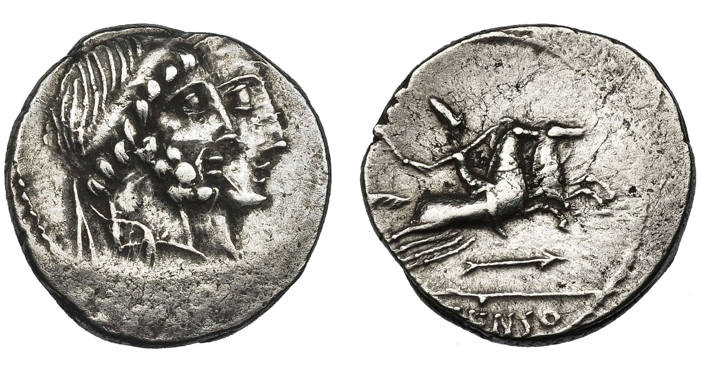 MARCIA. Denario. Roma (88 a.C.). A/ Símbolo o letra no visibles. R/ Flecha debajo del jinete. AR 3,64 g. 17,6 mm. CRAW-346.1d. FFC-859, 860. Descentrada. MBC.