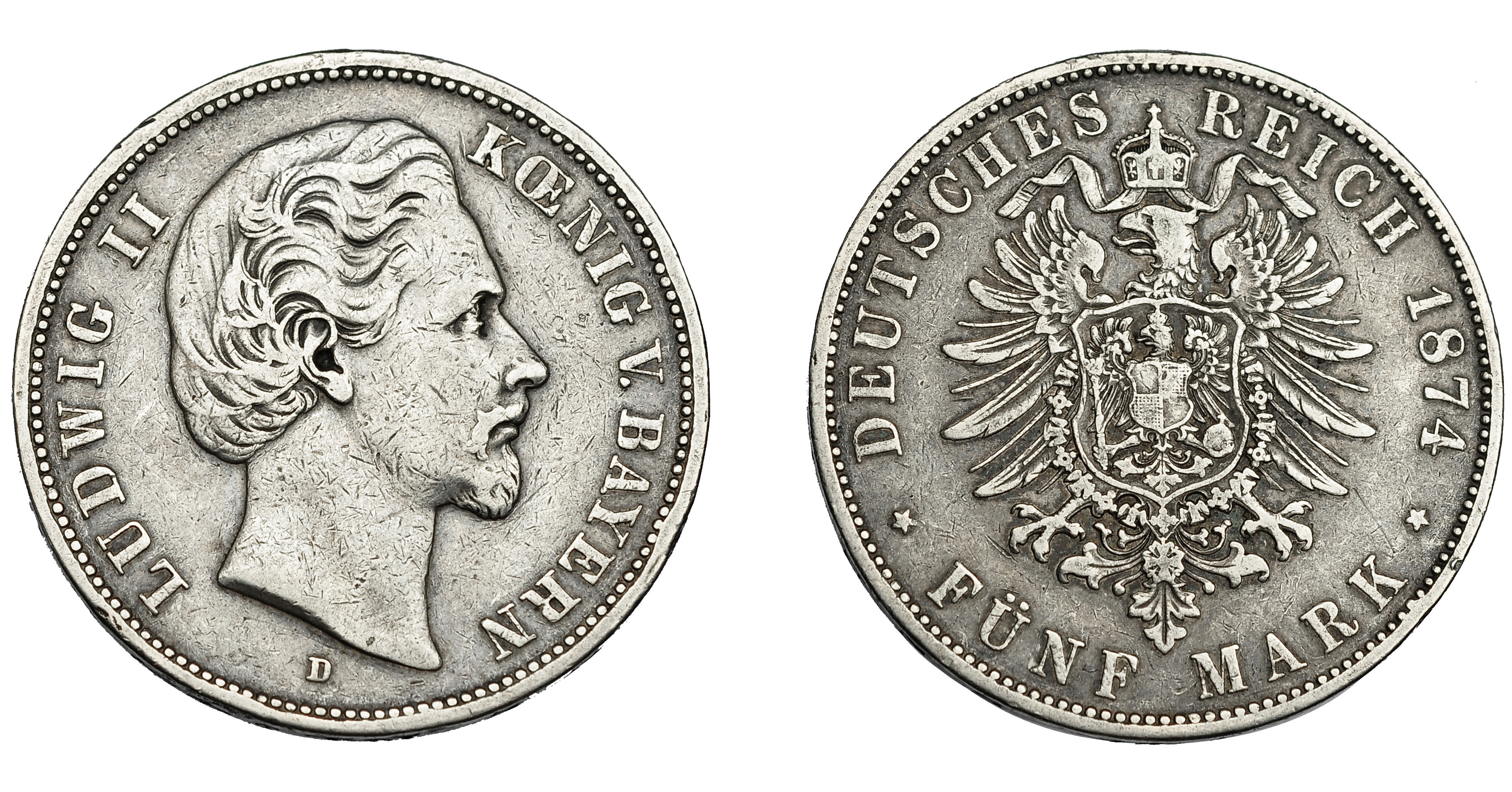MONEDAS EXTRANJERAS. ALEMANIA Y ESTADOS ALEMANES. Baviera. Luis II. 5 marcos. 1874. KM-502.085. MBC-.