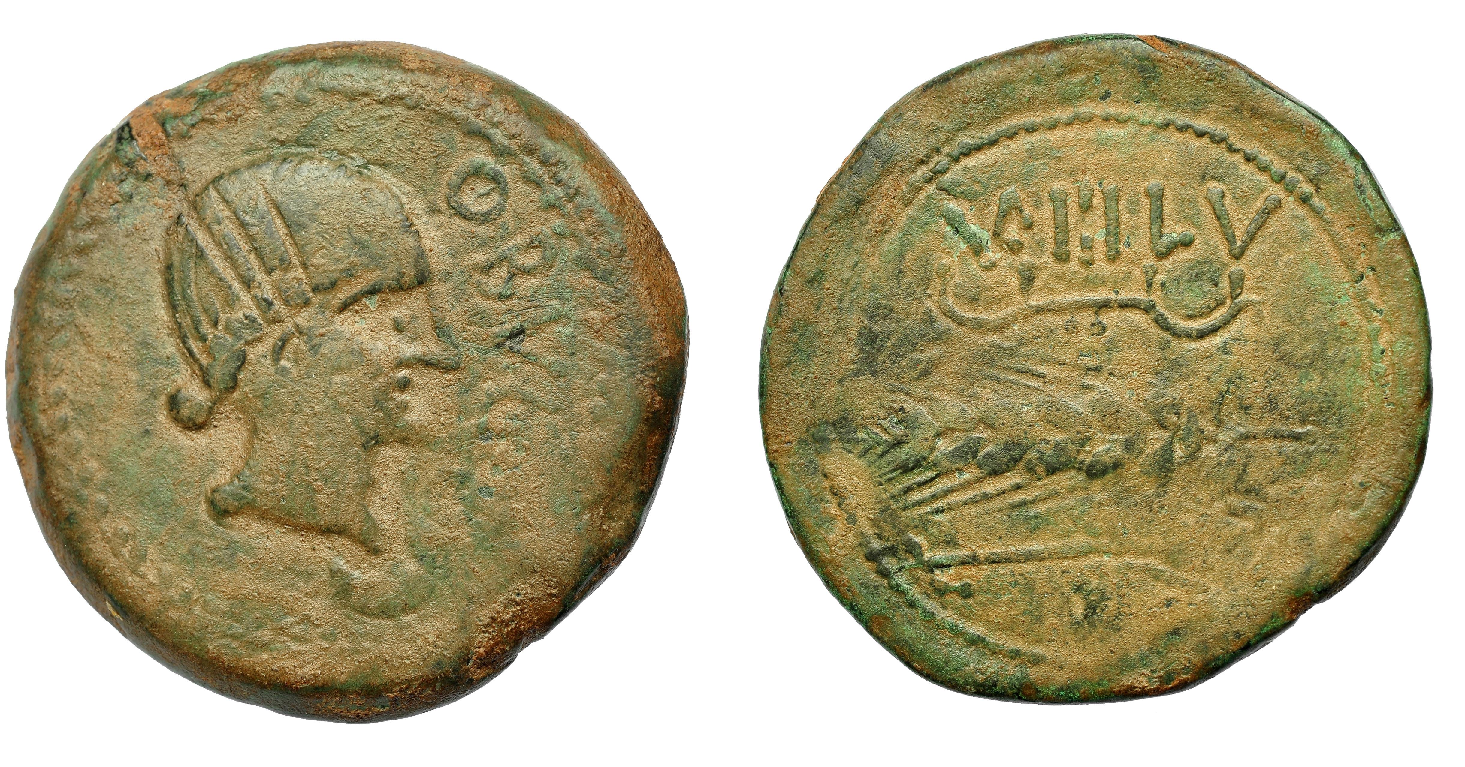 HISPANIA ANTIGUA. OBULCO. AS. A/ Cabeza femenina con moño a der., debajo creciente, delante OBVLCO, todo dentro de láurea. R/ Arado, espiga y yugo, debajo IBoLKa. AE 44,75 g. 40,61 mm. I-1778. ACIP-2184. Pátina verde. MBC-.