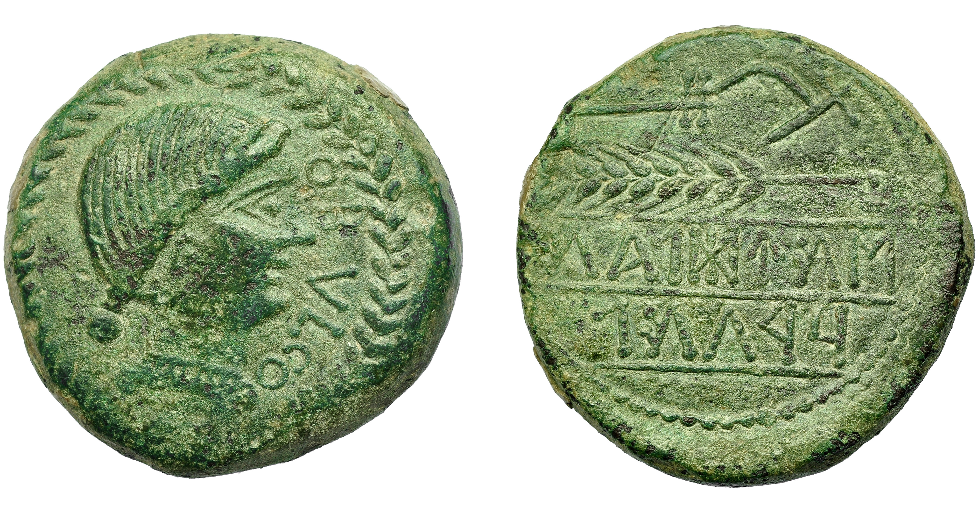 HISPANIA ANTIGUA. OBULCO. AS. A/ Cabeza femenina con moño a der., debajo creciente, delante OBVLCO, todo dentro de láurea. R/ Arado y espiga a izq., debajo en dos líneas SIBiBoLAI/URKaIL. AE 33,8 g. 33,97 mm. I-1779. ACIP-2185. Pátina verde. MBC/MBC+.