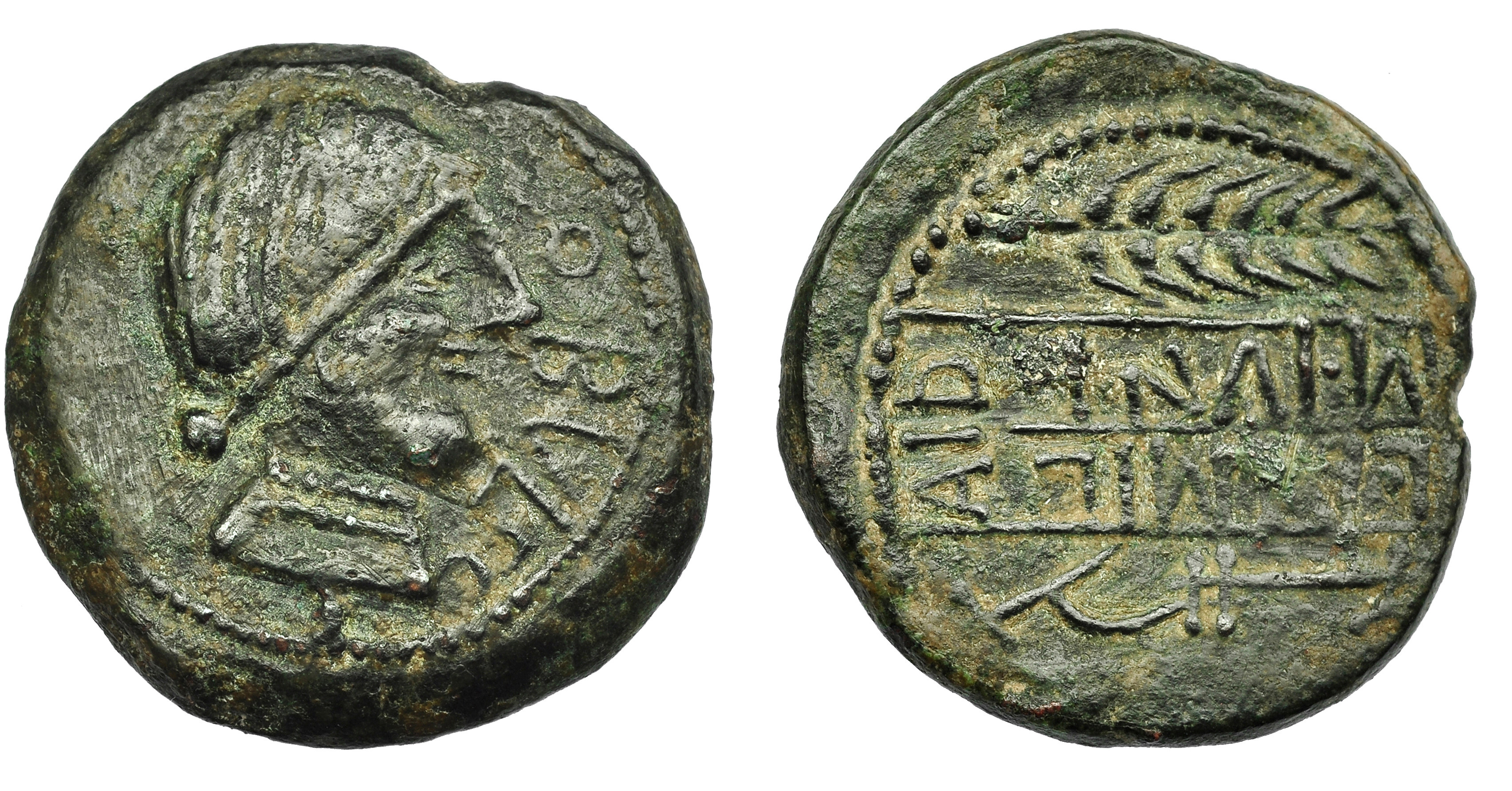 HISPANIA ANTIGUA. OBULCO. A/ Cabeza femenina con moño a der., delante OBVLCO. R/ Arado y espiga, entre ellos, entre líneas L AIMIL/M IVNI/ AID. AE 13,36 g. 28,43 mm. I-1807. ACIP-2222. Pátina verde oscuro. MBC. Ex Áureo, 30-6-1993, lote 2182.