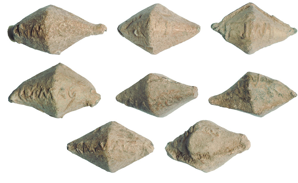 ROMA. República Romana. Lote de siete glandes (46-45 a.C.). Plomo. Epigrafíados con CN MAG (Cneo Pompeyo Magno). Longitud 4,3-4,5 mm.
