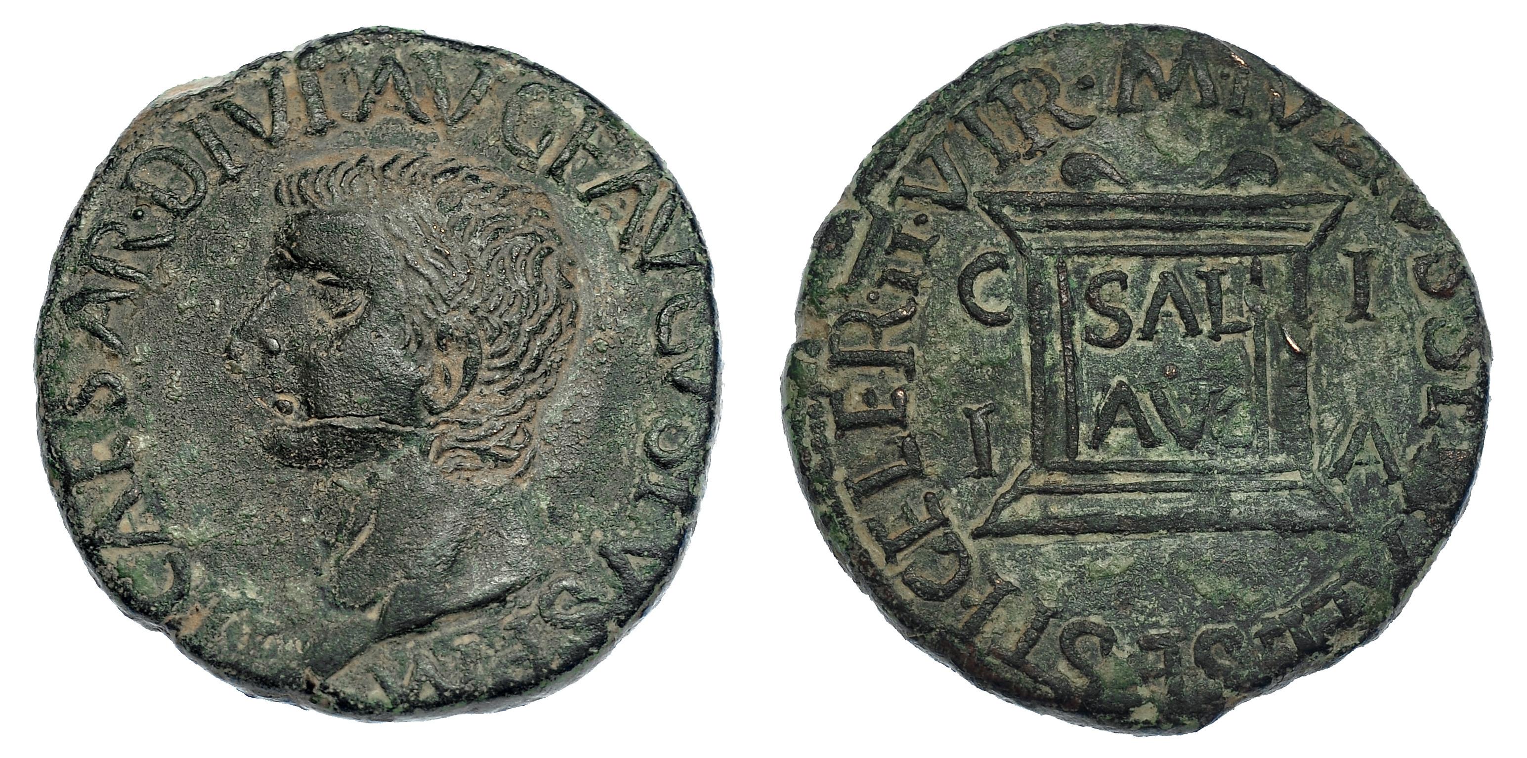 ILICI. As. Tiberio. A/ Cabeza de Tiberio a izq. R/ Altar con ley. SAL/AVG; alr. ley. con nombres de magistrados. RPC-196. APRH-196b. I-1522. Rayas en anv. Pátina verde. MBC+.