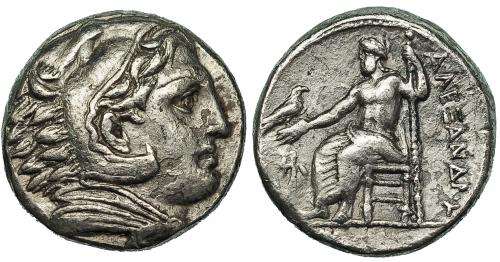 MACEDONIA. ALEJANDRO III. Tetradracma. Anfípolis (c. 325-323 a.C.). R/ Delante del trono Atenea. AR 16,81 g. PRC-105. Pequeñas erosiones. MBC/MBC-.