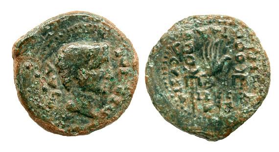 EMERITA. Semis. Augusto. A/ Cabeza a der.; PER CAE AVG. R/ Aquila entre dos signa; AVGVSTA-EMERITA, en campo L-E/V-X. AE 5,68 g. RPC-17. APRH-17a. ACIP-3380. CC-3886, mismo ejemplar. Pátina verde oscuro. BC+. Muy rara.
