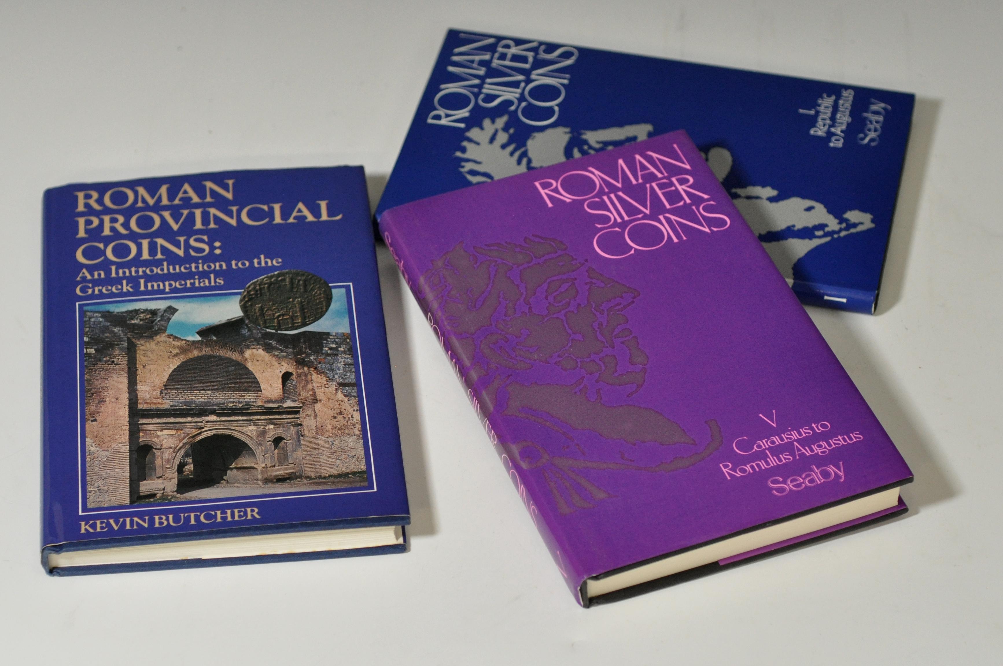 Lote 3 libros ed. Seaby: Roman Silver coins, vol I. Republic to Augustus, 1978, y vol. V. Carausius to Romulus Augustus, 1990, y K. Butcher, Roman Provincial coins: An Introduction to the Greek Imperials, 1988.