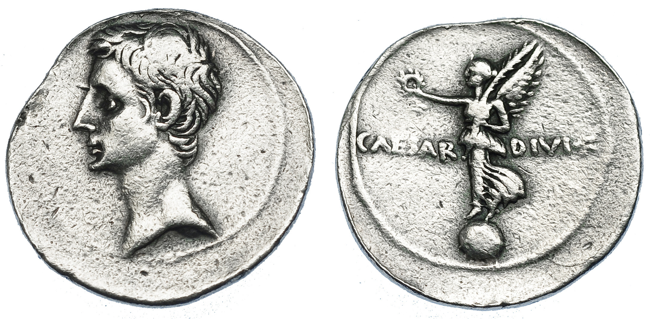 PERIODO DE JULIO CÉSAR A AUGUSTO. AUGUSTO. Denario. Brundisium o Roma (32-29 a.C.) A/ Cabeza a izq. R/ Victoria sobre globo con corona y palma a izq.; CAESAR DIVI F. AR 3,43 g. 21,2 mm. RIC-254b. FFC-48. Porosidades. MBC-. Escasa.