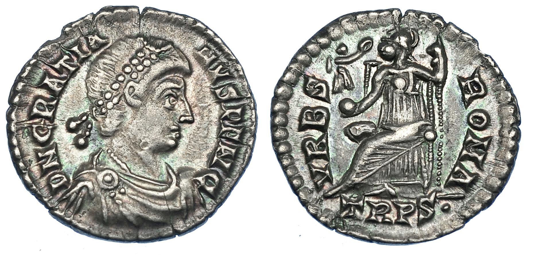 IMPERIO ROMANO. GRACIANO. Silicua. Treveris (367-375). A/ Busto diademado, drapeado y con coraza a der.; D N GRATIANVS P F AVG. R/ Roma sentada a izq. con cetro y victoria sobre globo; VRBS ROMA, exergo TRPS . AR 2,18 g. 17,9 mm. RIC-45c. MBC+/EBC-.