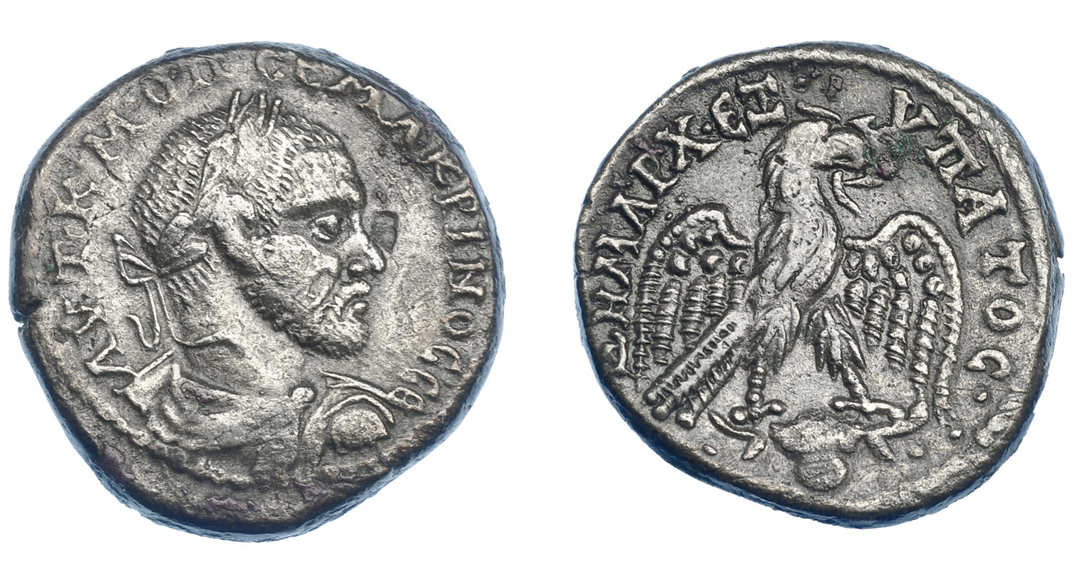 IMPERIO ROMANO. MACRINO. Tetradracma. Antioquía (217-218). A/ Busto laureado, drapeado y con coraza a der. R/ Águila mirando a der. con alas explayadas sobre cabeza de toro. VE 14 g. 25,7 mm. Prieur-828. Pequeñas concreciones. MBC. Ex col. Guadán 2583.