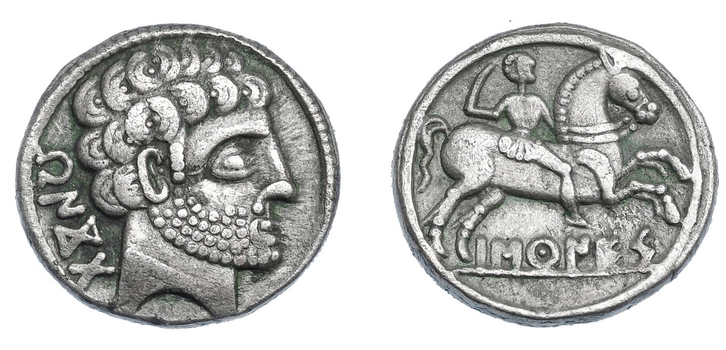 HISPANIA ANTIGUA. BASKUNES. Denario. A/ Cabeza masculina a der., detrás BeNKoTa. R/ Jinete con espada a der., debajo, sobre línea, BaSKuNES. AR 4,09 g. 17,8 mm. I-215. ACIP-1630. MBC.
