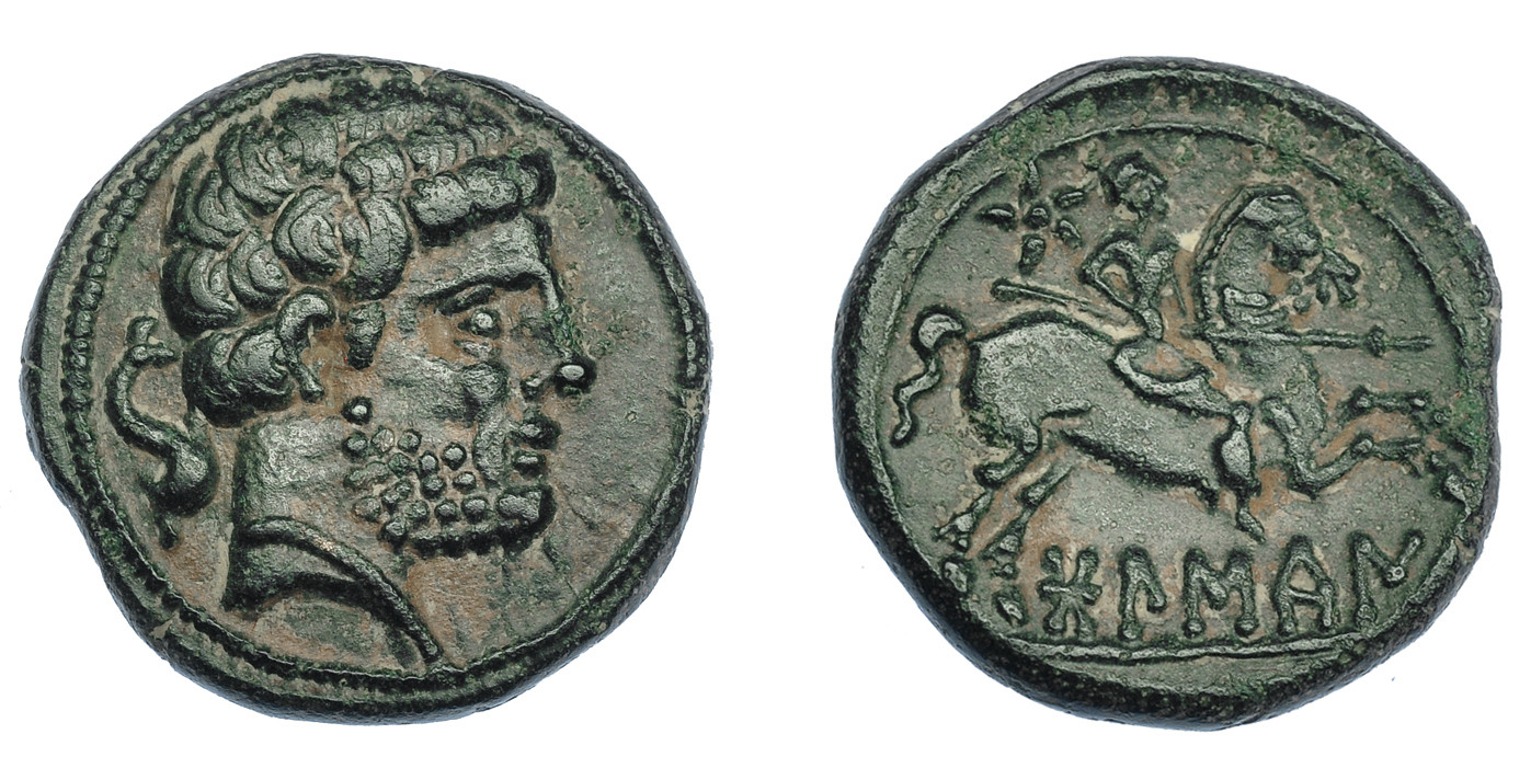 HISPANIA ANTIGUA. BOLSKAN. Unidad. A/ Cabeza masculina con collar a der., detrás delfín. R/ Jinete lancero a der., detrás estrella, debajo BoLSKaN. AE 7,82 g. 22,7 mm. I-1918. ACIP-1419. Pátina verde oscuro. MBC+/EBC-.