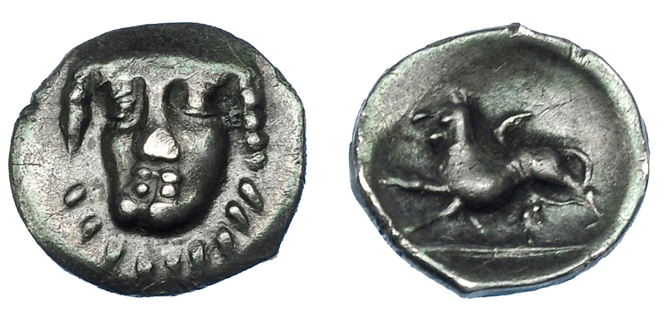 GRECIA ANTIGUA. CAMPANIA. Phistelia. Óbolo (325-275 a.C.). A/ Cabeza femenina de frente a izq. R/ León a izq. AR 0,57 g. 10,92 mm. COP-577 vte. ANS-590 vte. Muy escasa. Ex colección Guadán 1342.