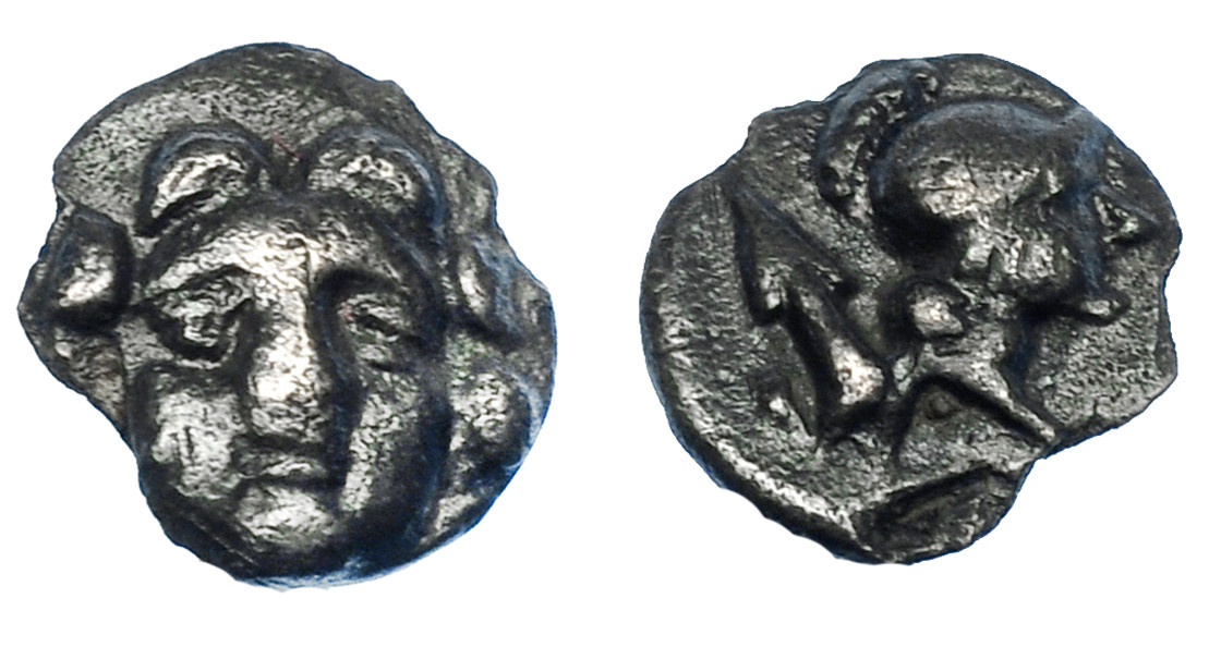 GRECIA ANTIGUA. PISIDIA. Selge. Óbolo (300-190 a.C.). A/ Cabeza de Gorgona. R/ Cabeza de Atenea a der., detrás punta de lanza. AR 0,70 g. 9,4 mm. COP-253. SBG-5479. Roturas al borde. MBC. Ex colección Guadán 2445.