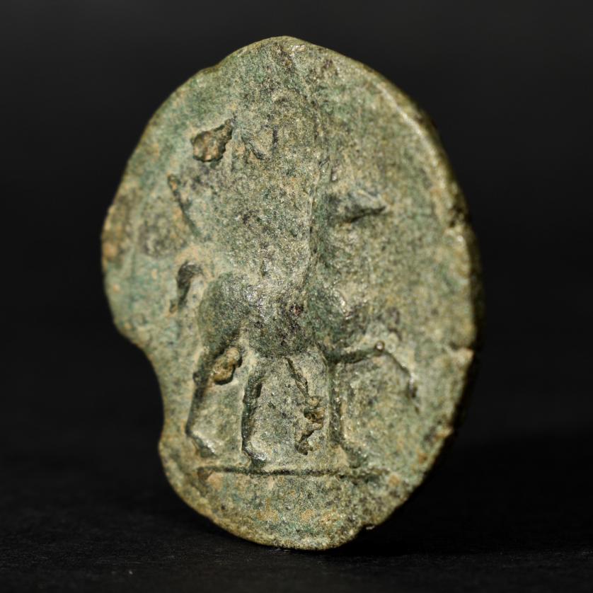 HISPANIA ANTIGUA. SACILI. Unidad. A/ Elefante a der., encima SACILI. R/ Caballo al paso a der., por detrás cetro, encima ley. fenicia. AE 15,28 g. 33,10 mm. I-2018. ACIP-956. Cospel irregular. Pátina verde gruesa. MBC-/MBC. Muy rara. Ex subasta Jesús Vico 44 (2000), lote 47.