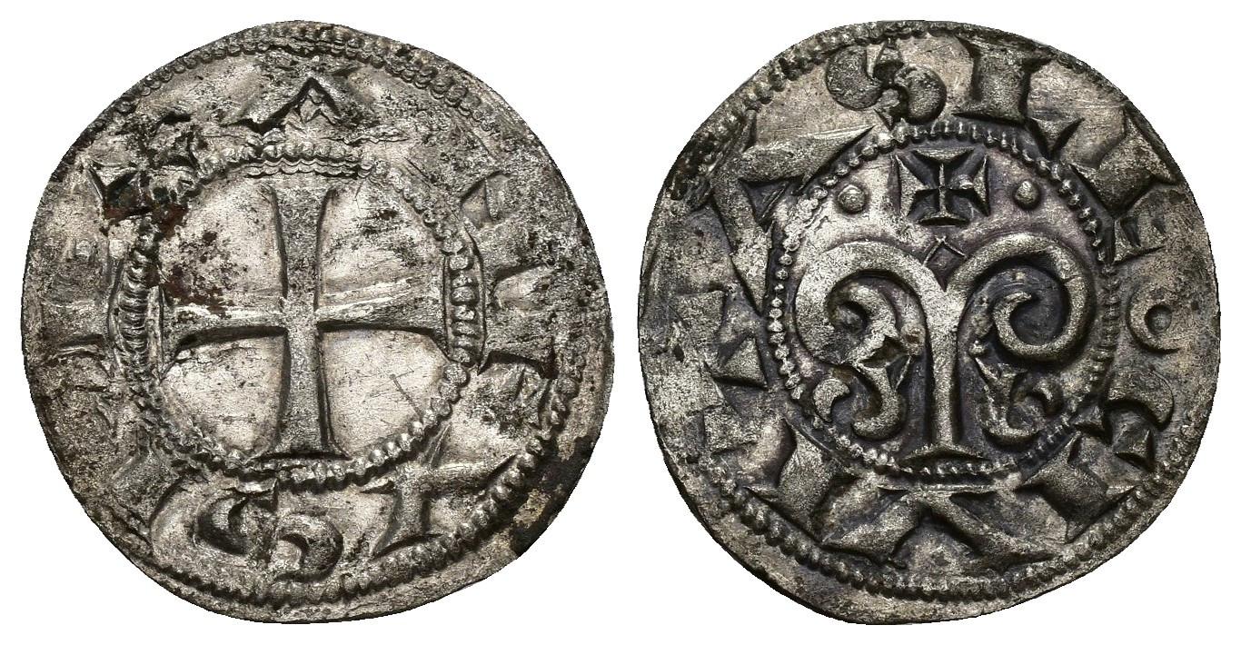 REINOS DE CASTILLA Y LEÓN. ALFONSO VII. Dinero. ¿León? (1126-c. 1130). A/ Cruz griega; ANFVS REX. R/ Árbol de Jesé, en la parte superior cruz entre dos puntos; LEO CIVITAS. VE 1,01 g. 19,2 mm. I-55.1 vte. MM-A7:18:7. MOMECA-9.1A.2. Imperatrix A7:18.7, este ejemplar ilustrado. Leves erosiones. EBC-. Muy rara.