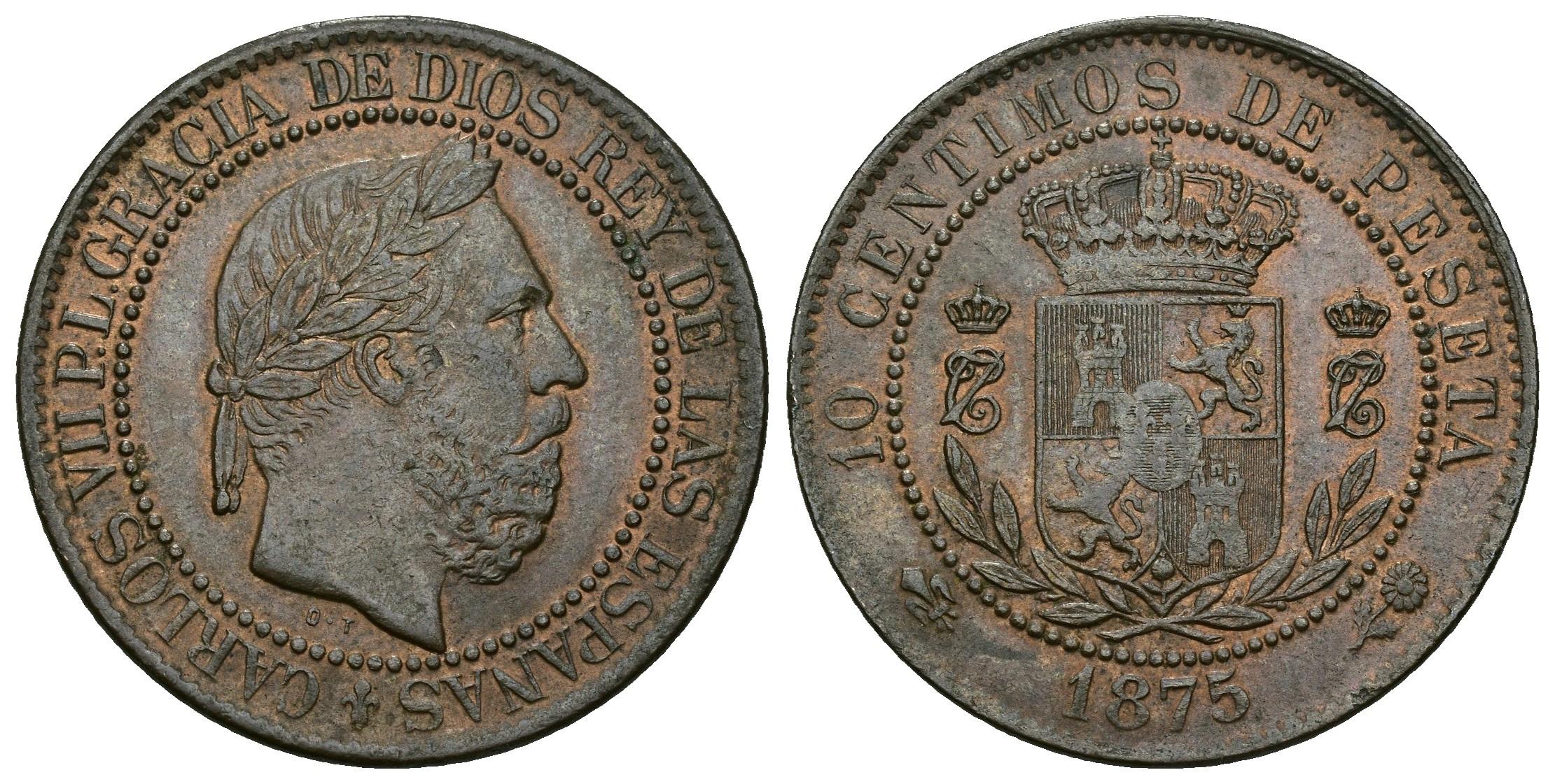 CARLOS VII. 10 céntimos. 1875 Bruselas. Rev. Girado 180º. AR 10,29 g. 30,34 mm. VII-117.1. Acuñación floja en rev. R.B.O. MBC+.