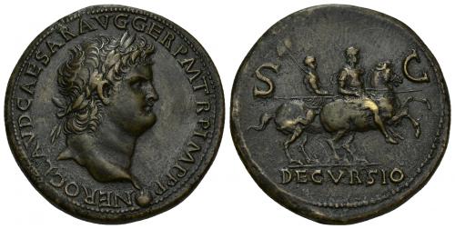IMPERIO ROMANO. NERÓN. Sestercio. Lugdunum (62-68 d.C.). A/ Cabeza laureada a der.; NERO CLAVD CAESAR AVG GER P M TR P IMP P P. R/ Nerón con lanza a caballo a der., detrás otro jinete con vexillum, en campo S-C, en exergo DECVRSIO. AE 25,35 mm. 35,8 mm. RIC-436. Campos repasados. EBC-/MBC+.