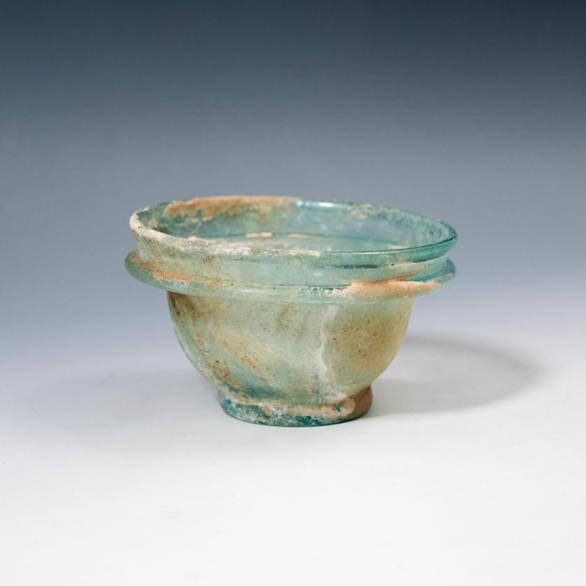ARQUEOLOGÍA. ROMA. Imperio Romano. Cuenco con base y doble linea en borde. Vidrio. Dimensiones 7,5 cm x 11,5 cm. Ex colección Rafael Tauler Fesser.