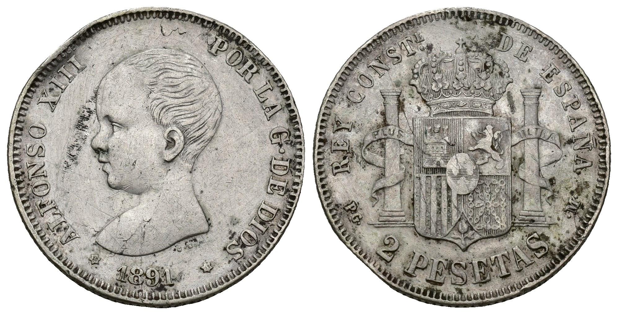 ALFONSO XIII. 2 pesetas. 1891*18-91. Madrid. PGM. AR 10,00 g. 27,1 mm. VII-172. Rayitas, leves oxidaciones y golpe en canto. MBC+. Escasa.