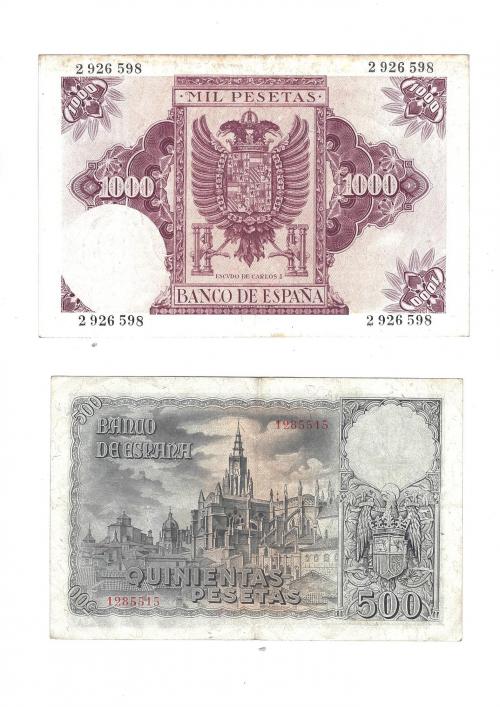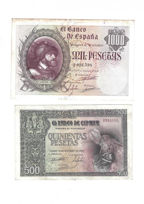 BILLETES ESPAÑOLES. Lote de 2 billetes: 500 y 1000 pts. 10-1940. Sin serie. ED D-45 y 46. Sin manipular. MBC y MBC+.