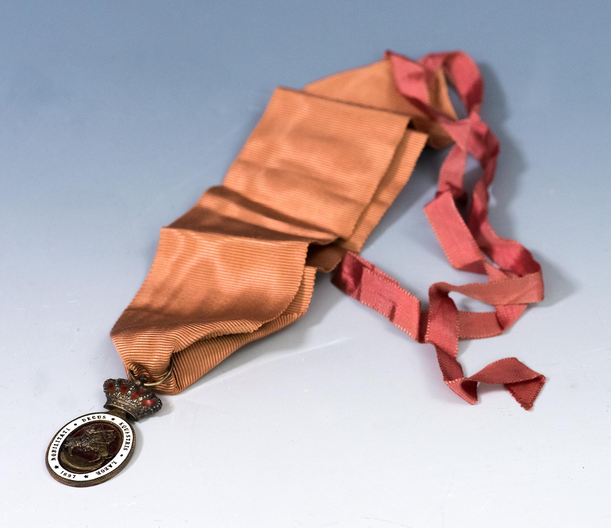 MEDALLAS Y CONDECORACIONES. ISABEL II. Real Maestranza de Caballería de Valencia. Venera en plata dorada y esmaltes con cinta para el cuello. 43,9 x 22,1 mm. 32,9 x 19,7 mm. G-490. Escasa. SC.