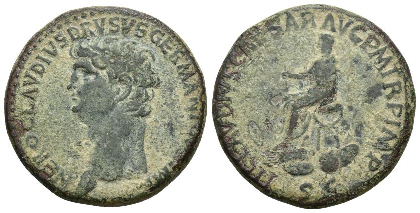 IMPERIO ROMANO. DRUSO EL MAYOR (bajo Claudio I). Sestercio. Roma (41-50 d.C.). A/ Cabeza a izq.; NERO CLAVDIVS DRVSVS GERMANICVS IMP. R/ Claudio sentado en silla curul a izq. con rama y rodeado de armas, exergo S C; TI CLAVDIVS CAESAR AVG P M TR P IMP. AE 26,27 g. 34,4 mm. RIC-93. Pátina verde terrosa. MBC-. Rara.