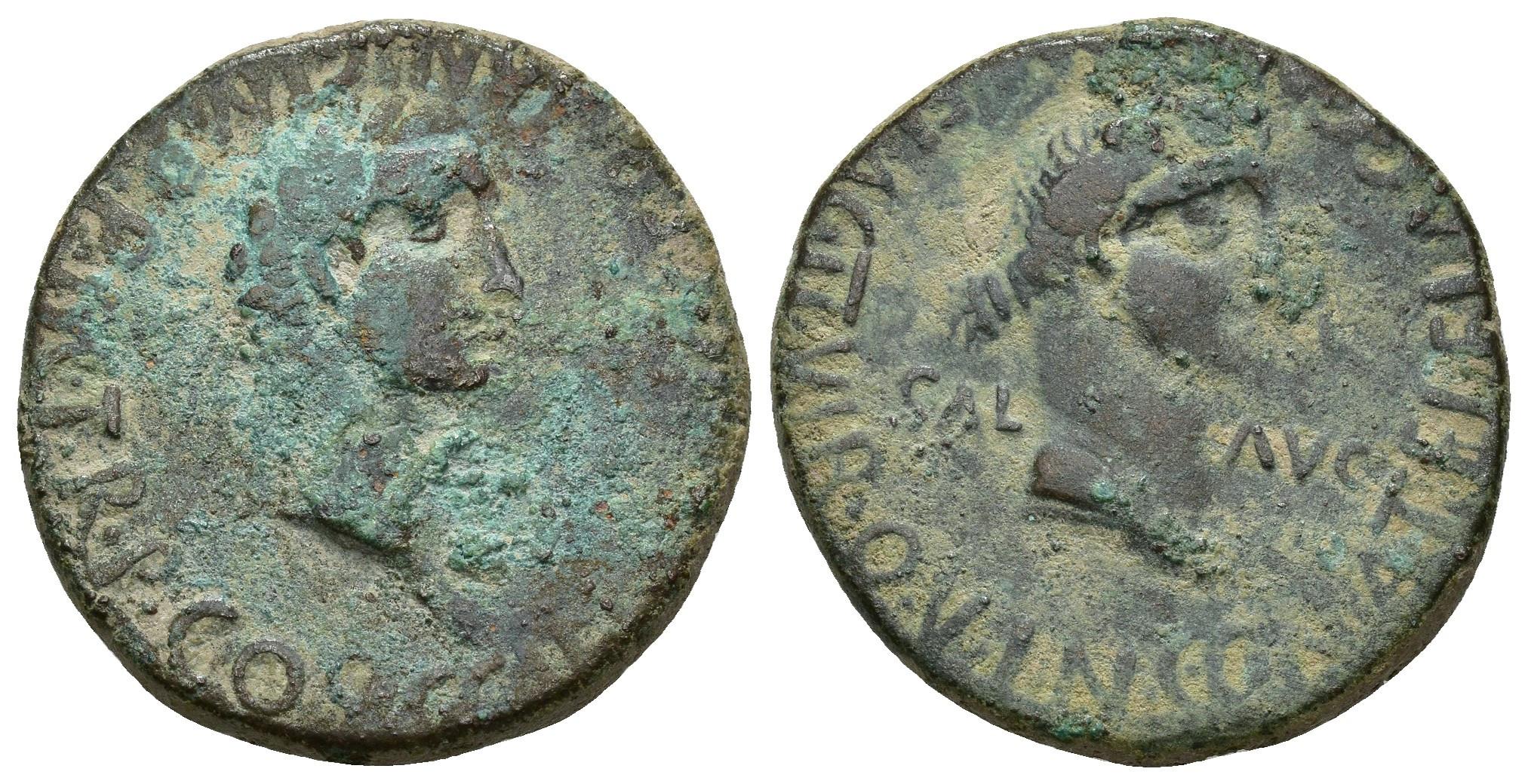 HISPANIA ANTIGUA. CARTAGONOVA. Calígula. As. A/ Cabeza laureada a der.; C CAESAR AVG GERMANIC IMP P M TR P COS. R/ Cabeza de Salus a der.; SAL-AVG, C N ATEL FAC CN POM FLAC II VIR Q V I N C. AE 12,35 g. 28 mm. I-613. APRH-185. ACIP-3155. Oxidaciones. MBC-.
