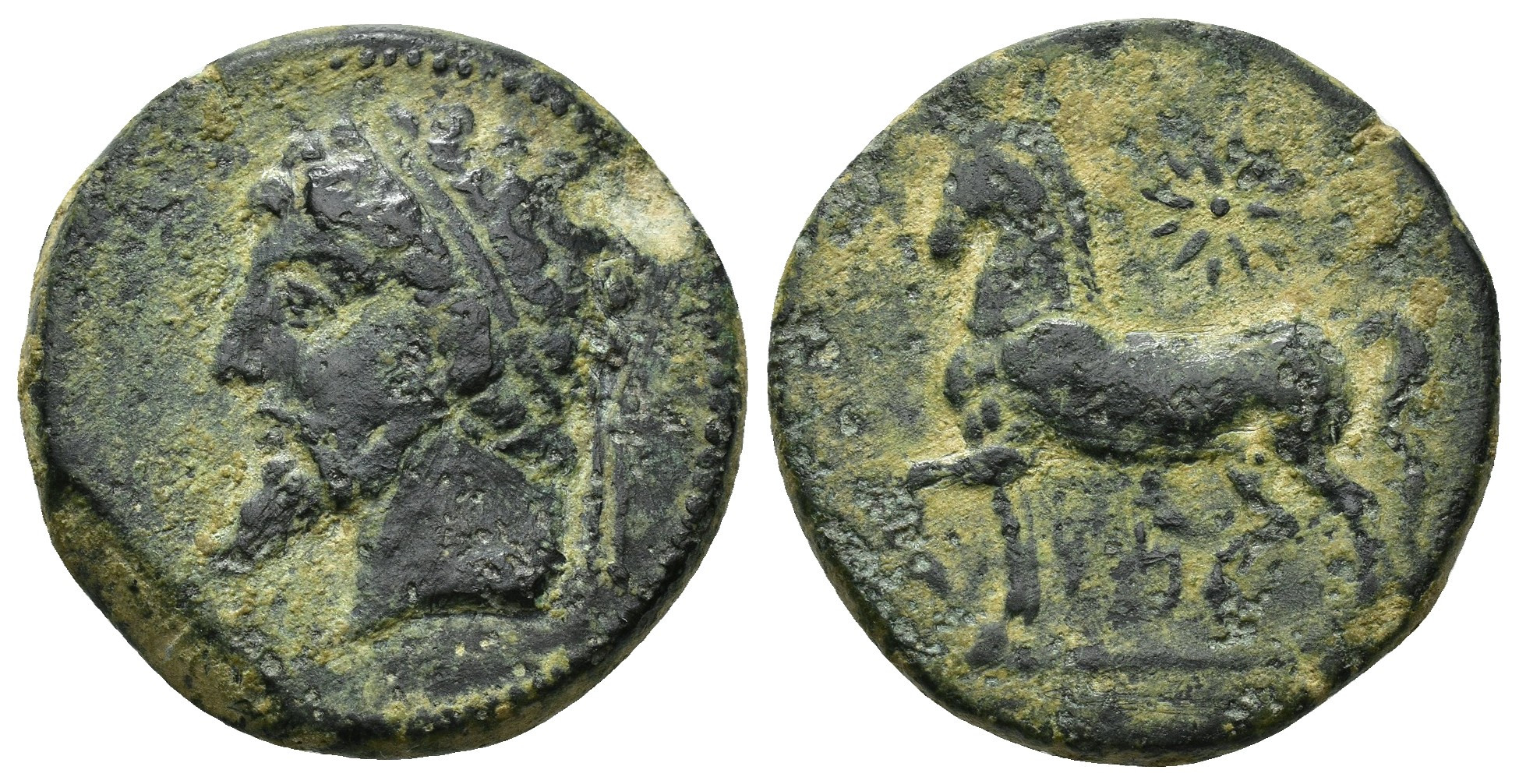 COLECCIÓN CORES. REYES NÚMIDAS Y MAURETANOS. MASINISSA O MICIPSA. Unidad. ¿Cirta o Siga? (238-148 o 148-118 a.C.). A/ Cabeza del rey diademada a izq. R/ Caballo avanzando a izq., encima estrella, debajo letras púnicas mn. AE 13,84 g. 26 mm. COP-495; MAA-22; CC-5716, mismo ejemplar. Pátina verde. MBC-. Muy escasa.