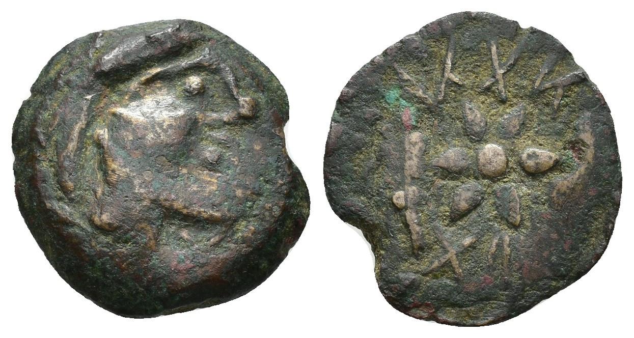 COLECCIÓN CORES. REYES NÚMIDAS Y MAURETANOS. BOCCO I. Shemesh (¿118-80 a.C.?). A/ Cabeza a der.; bqs hmmlkt. R/ Estrella entre espiga y racimo, debajo zig-zag; ley. mqm sms. AE 3,24 g. 17 mm. MAA-45d; CC-5751, mismo ejemplar. Pequeña rotura al borde. MBC-. Rara.