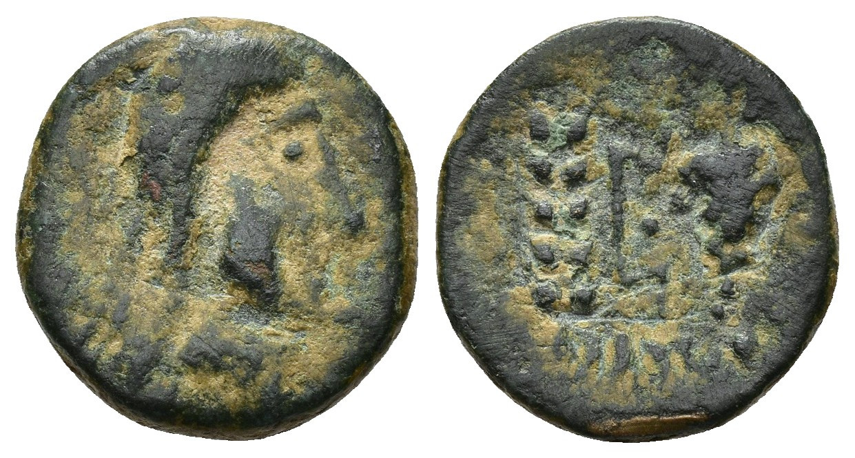 COLECCIÓN CORES. MAURETANIA OCCIDENTAL. ¿Tamuda? A/ Cabeza a der. R/ Zig-zag con glóbulo entre racimo y espiga, debajo ley. púnica. AE 3,91 g. 17 mm. M-254; CC-6007, mismo ejemplar. Pátina verde oscuro. BC+/MBC-.