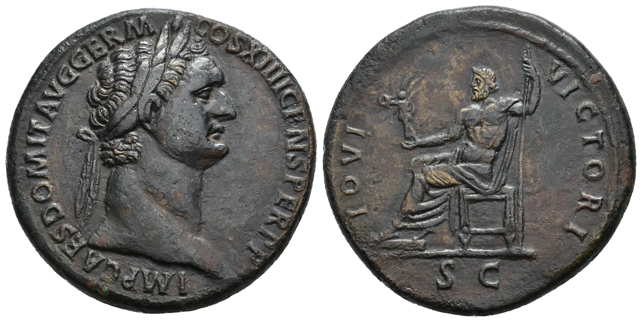 IMPERIO ROMANO. DOMICIANO. Sestercio. Roma (88-89 d.C.). A/ Cabeza laureada a der.; IMP CAES DOMIT AVG GERM COS XIIII CENS PER P P. R/ Júpiter entronizado a izq. con victoria y cetro; IOVI VICTORI, S C. AE 25 g. 35,47 mm. RIC-633. Campos repasados. Pátina oscura. MBC+/MBC.