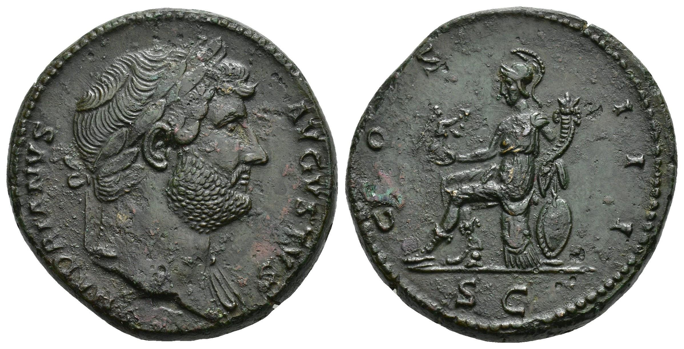 IMPERIO ROMANO. ADRIANO. Sestercio. Roma (124-128). A/ Cabeza laureada y drapeada al hombro a der.; HADRIANVS AVGVSTVS. R/ Roma sentada a izq. sobre coraza y apoyada en escudo, sosteniendo Victoria y cornucopia; COS III, exergo SC. AE 25,55 g. 33,04 mm. RIC-870. Pátina oscura con pequeñas erosiones. EBC-/MBC+.