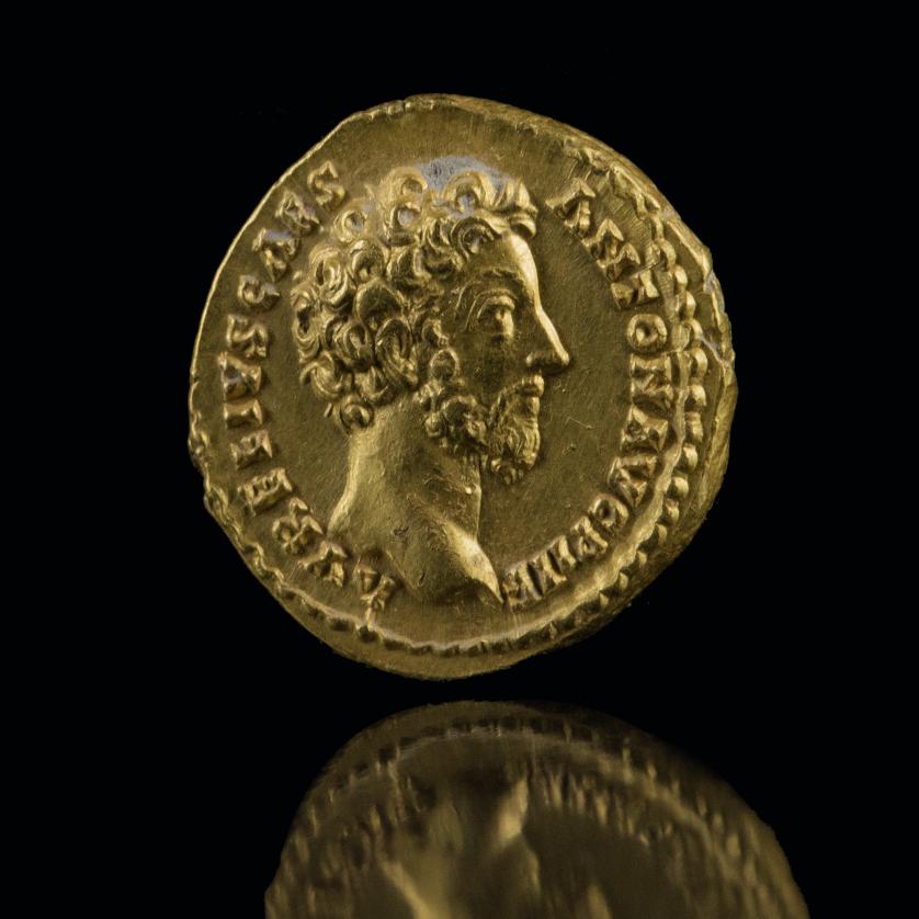 IMPERIO ROMANO. MARCO AURELIO (bajo Antonino Pío). Áureo. Roma (156-157). A/ Cabeza a der.; AVRELIVS CAES ANTON AVG PII F. R/ Apolo a izq. con lira y pátera; TR POT XI COS II. AU 7,32 g. 18,72 mm. RIC-469A. Pequeñas marcas. EBC.