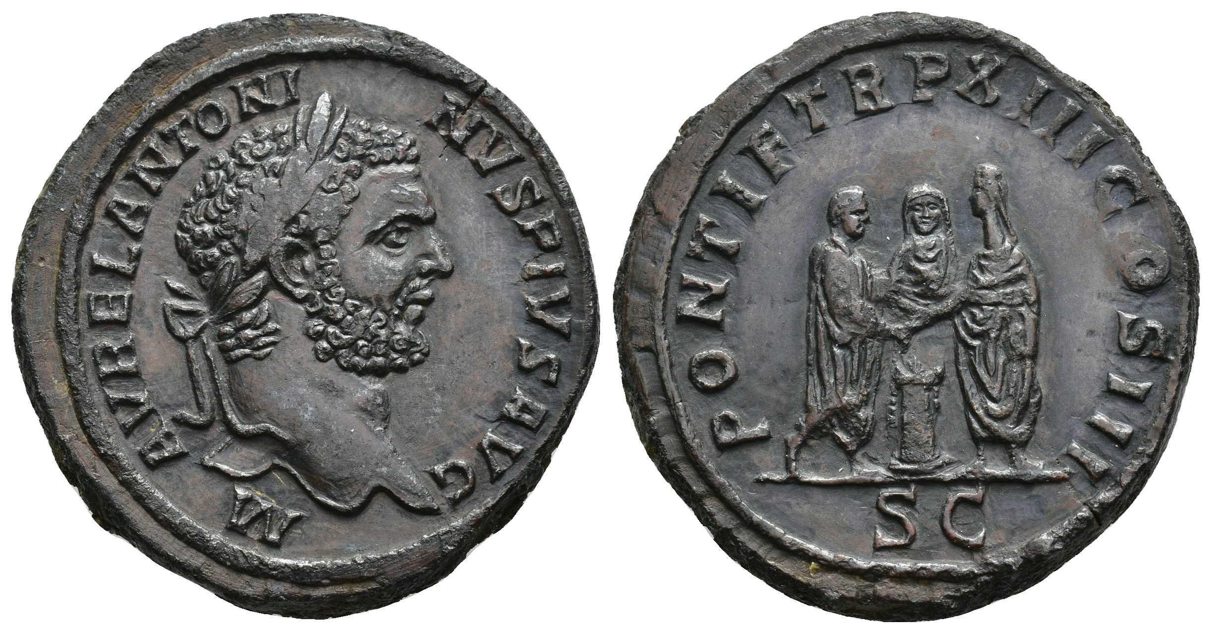 IMPERIO ROMANO. CARACALLA. Sestercio. Roma (210). A/ Cabeza laureada a der.; M AVREL ANTONINVS PIVS AVG. R/ Caracalla y Geta, togados y velados, cara a cara, sacrificando en altar, entre ellos Concordia de frente; PONTIF TR P XIII COS III, SC. AE 25,25 g. 33,86 mm. RIC-452A. Campos repasados. Pátina oscura. MBC+.