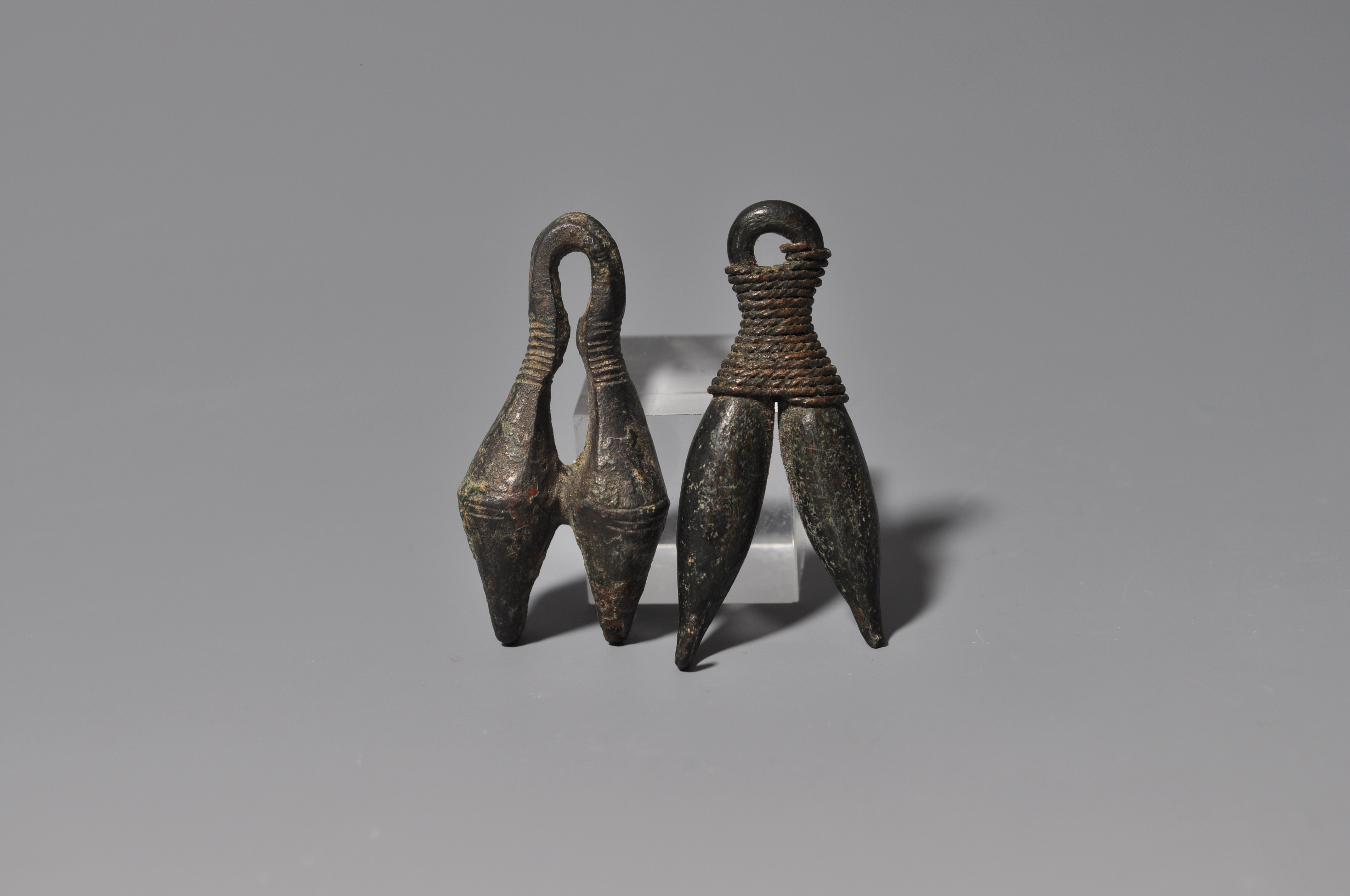 HISPANIA ANTIGUA. Cultura celtibérica. Lote de 2 pasadores (ss. IV-II a.C.). Bronce. Longitud de 4 a 4,2 cm.
