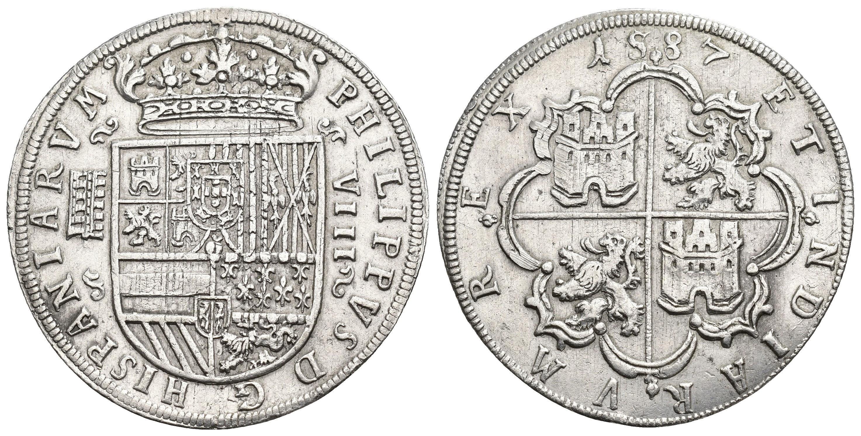 FELIPE II. 8 reales. 1587. Segovia. Acueducto de 11 arcos en dos pisos. Adornos encima y debajo de la marca de ceca y valor como en AC-tipo 201. AR 27,35 g. 40,87 mm. AC-691 var. EBC-. Muy rara.
