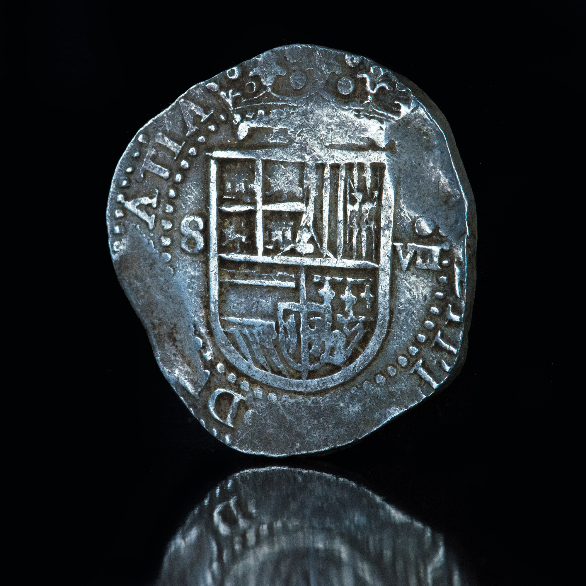 FELIPE II. 8 reales. S/F. Sevilla. F en rev. AR 27,3 g. 38,45 mm. AC-723. Rara.