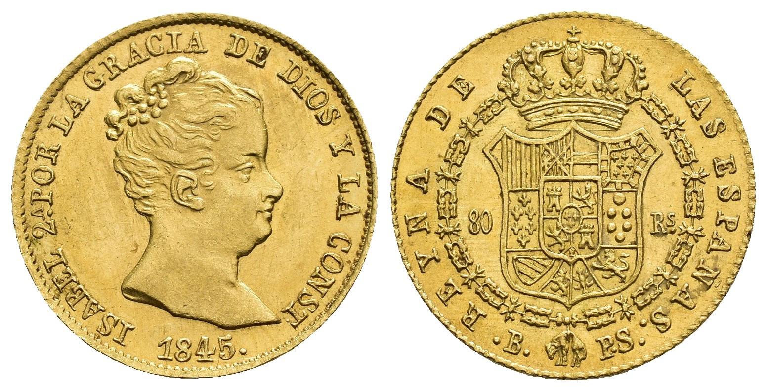 ISABEL II. 80 reales. 1845. Barcelona. PS. AU 6,76 g. 20,9 mm. VI-588. B.O. EBC+.