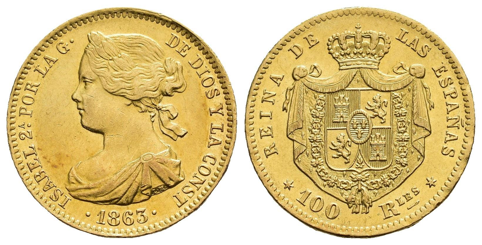 ISABEL II. 100 reales. 1863. Madrid. AU 8,37 g. 22,2 mm. VI-650. B.O. EBC+.
